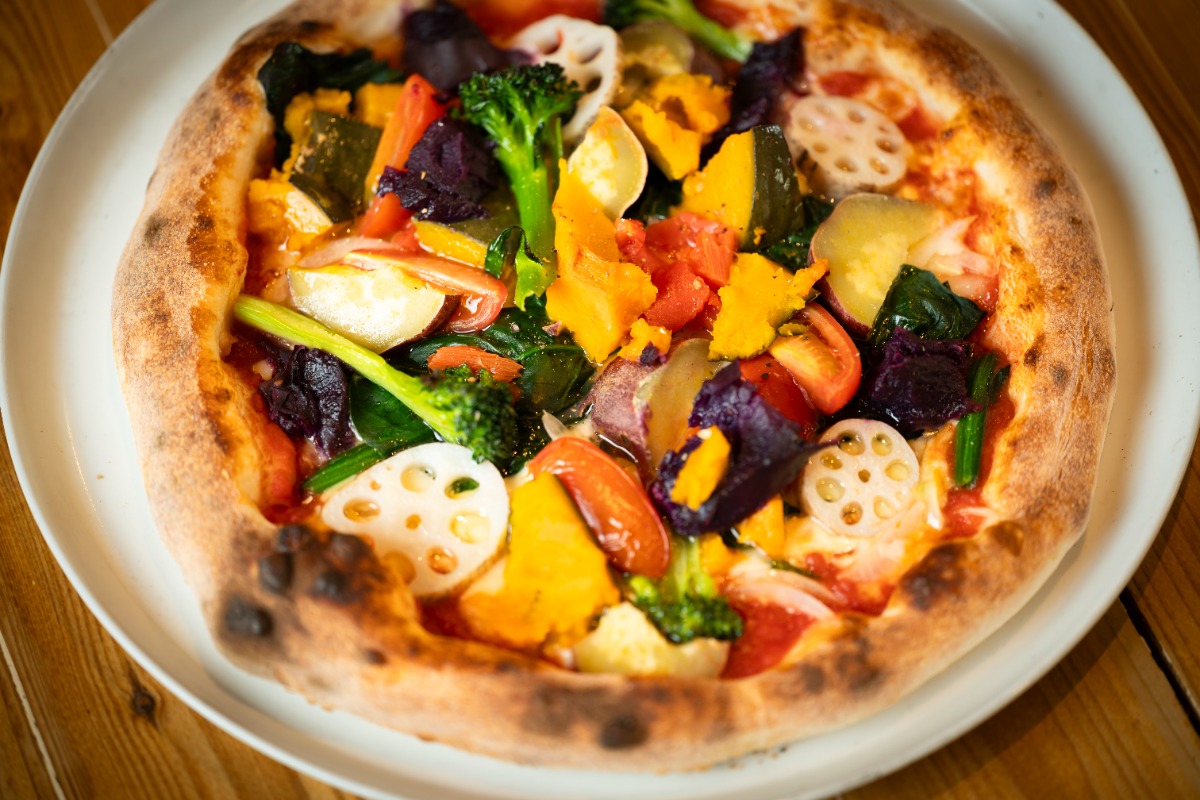 店主自ら買い付けた愛媛県産の旬野菜を、惜しみなくたっぷり使った贅沢な野菜ピッツァ。できるだけ東温市産の野菜を使用しているそう。トマトソースをベースに、野菜の食感や味わいを感じられる贅沢な一枚です。