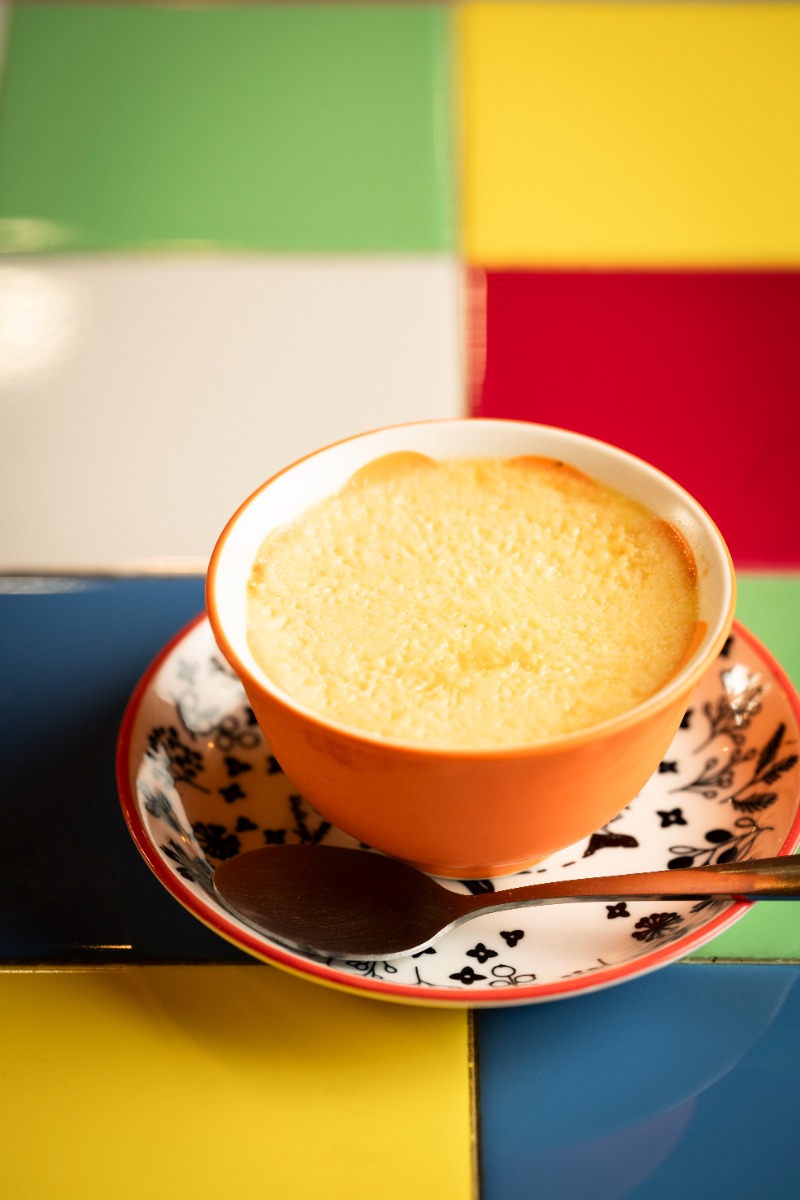 薪窯の温度調整は難しく、その絶妙な焼き加減は職人の技あってこそ。日によって表面に薪窯特有の焦げ目がつき、ほろ苦いアクセントが楽しめるのも魅力です。牛乳・卵・きび砂糖・生クリーム・バニラを使用し、程よい甘さで固めの食感。底のカラメルと絡めながらどうぞ。