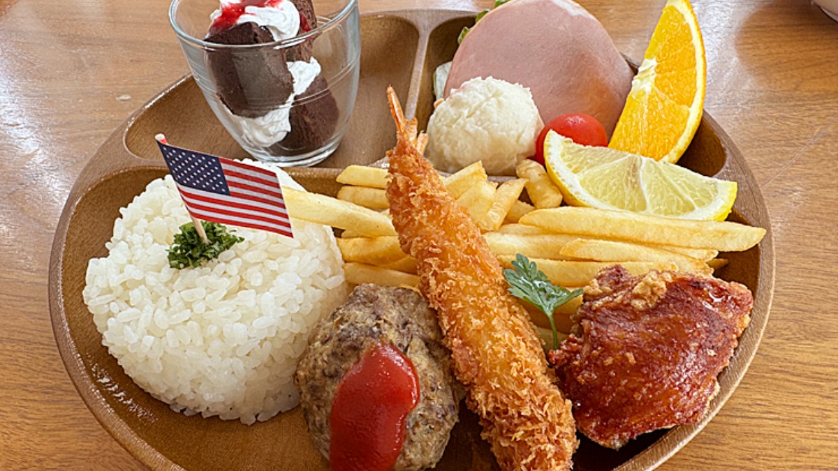 卵4個を使い、たっぷりのダシを入れて作られた出汁巻きたまごのサンドに、地元産野菜中心の新鮮サラダと選べるドリンクが付いた人気ランチ。
