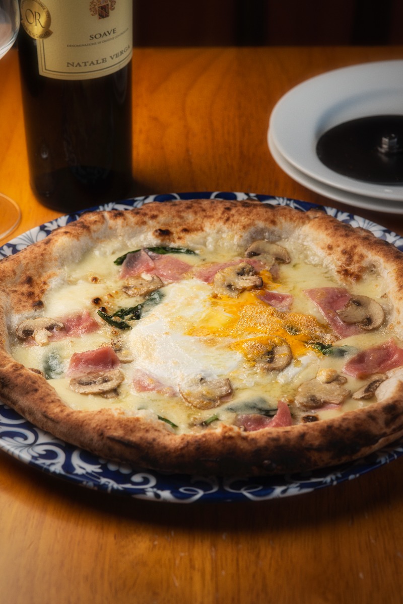 48時間寝かせた生地にたっぷりのモッツァレラチーズ、バジル、しまなみ海道の大島にある「小原ハム工房」、卵をトッピング。コクと旨みのある粉状グラナパダーノとEVOオイルもかけて焼き上げた新メニューです。