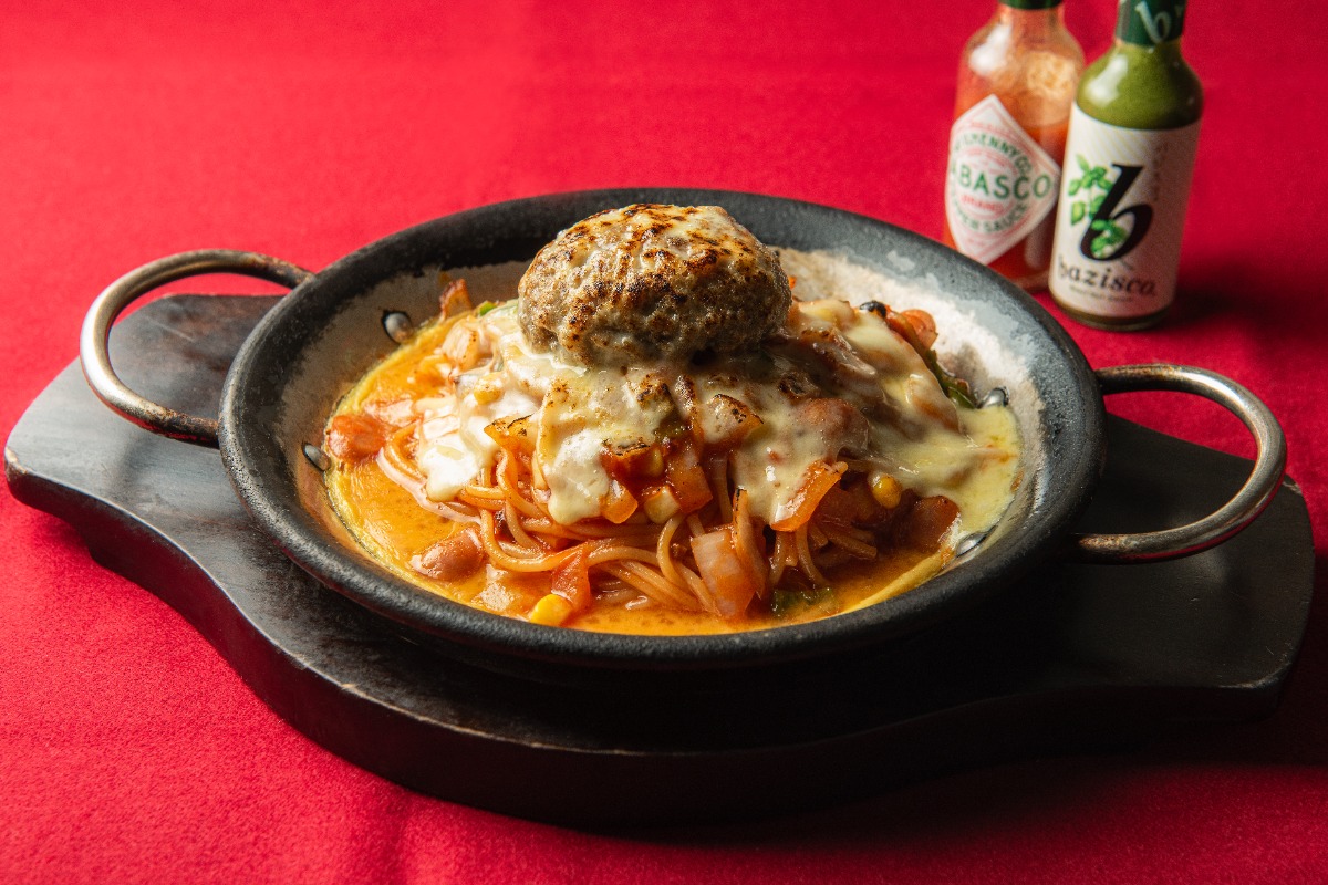 ほど良く酸味が効き、深みのあるオリジナルソースに絡んだパスタと、たまごや炙りチーズ、ハンバーグの旨みが相まった究極の一皿。