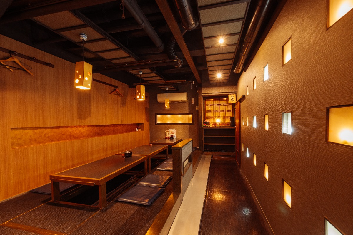 店内には、しっとりと落ち着いた雰囲気のテーブル席とカウンター席、そしてゆったり座ってくつろげる掘りごたつ席もあります。約20~40人で貸し切りにも対応(要相談)!