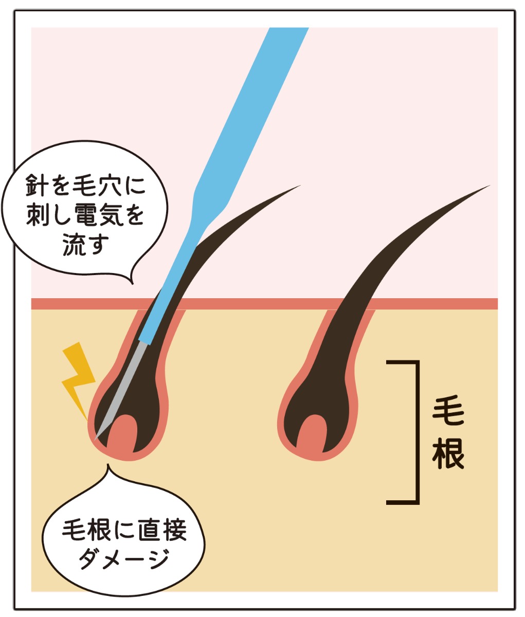 当院で導入しているRF針脱毛は、細い針を毛穴に挿入し、一瞬電気を流すことによって毛根にダメージを与え脱毛する施術です。1本1本の毛を抜くことができるので、まだらに残ったひげの脱毛にも効果的。レーザーでは不可能な白髪の脱毛も可能です。またレーザー脱毛を継続していると、生き残った毛が太く濃くなってしまう硬毛化が起こることがあります。そうなると治療が難しいのですが、針脱毛であれば抜くことができます。