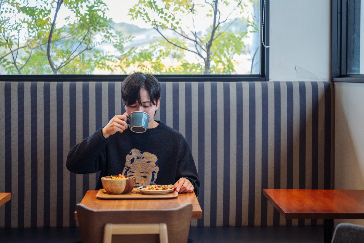 酸味を抑えたオリジナルの豆を使った淹れたてのコーヒーと米粉パンを片手に、広々とした店内で優雅な時間を過ごしてくださいね。