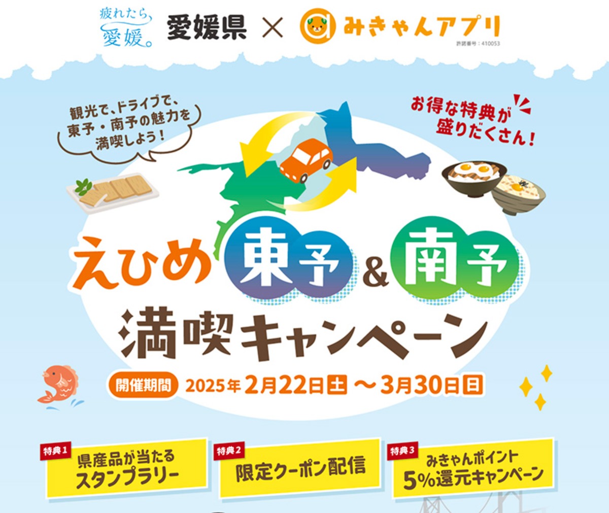 2/22(土)から、「えひめ東予・南予満喫キャンペーン」がスタート! 観光施設や飲食店等で使えるお得なクーポンの配信や、県産品が当たるスタンプラリーなどがあり、ドライブや観光で東予・南予をお得に周遊できます。「みきゃんアプリ」を活用して、観光地や行き方などさまざまな情報も入手できます。