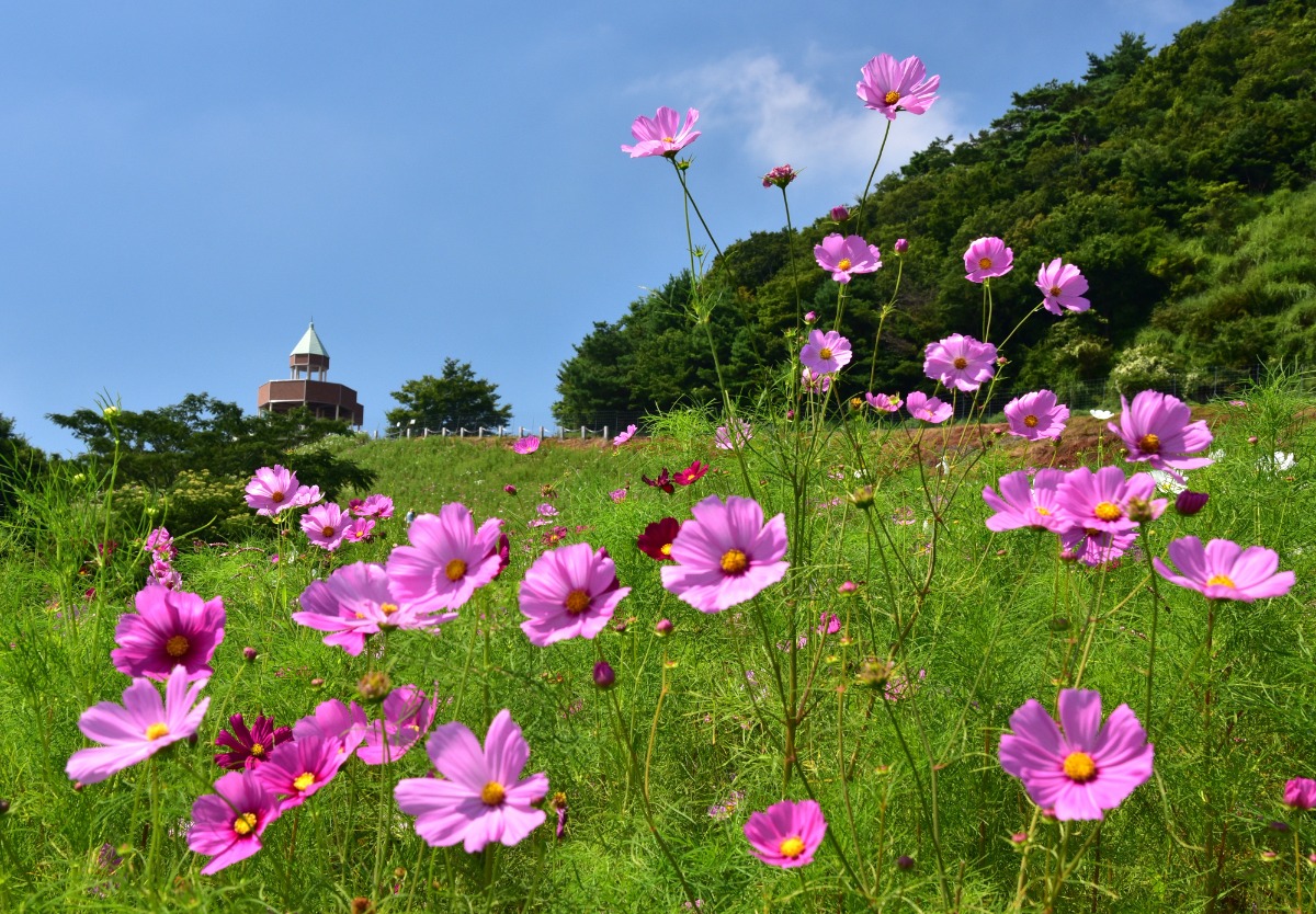 夏から初秋には早咲きのコスモスが咲き誇り、8月下旬にはコスモス祭りも開催されます。
