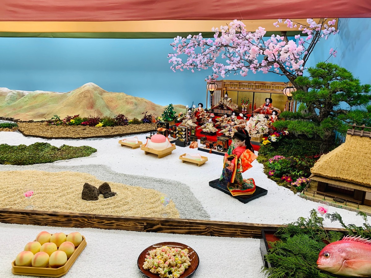 管理棟では座敷雛や「認定こども園八幡幼稚園」の園児手作りのひな人形も展示しています。