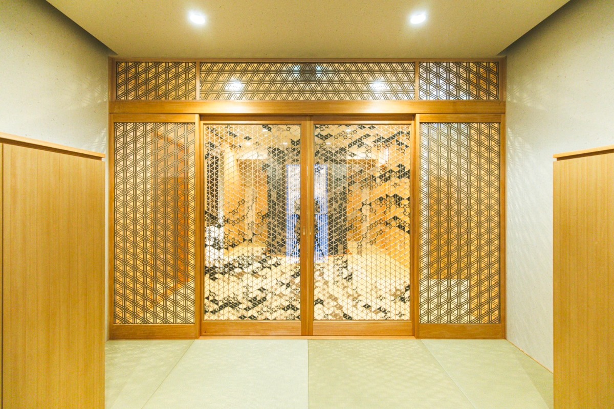 「Musubi」の扉を開けると、まず目に飛び込んでくるのは水の流れを感じさせる美しい組子。