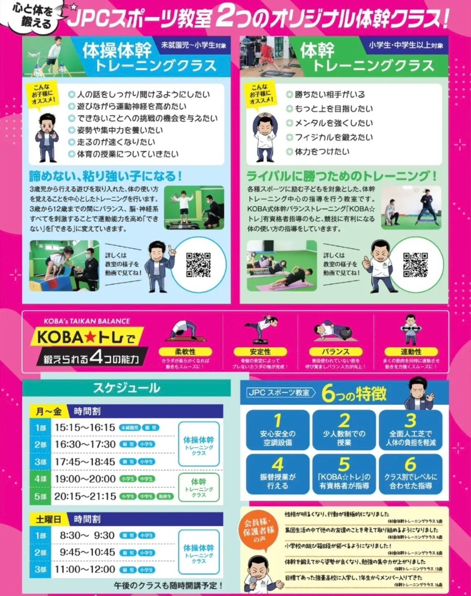 スポーツを始める前の子どもには基本動作を身につけ、プロを目指す子どもには怪我をしにくい身体づくりを教えるなどレベルに合わせて指導してくれる「JPC」。跳び箱や縄跳びなど毎回メニューが変わるのも嬉しいポイントです。
