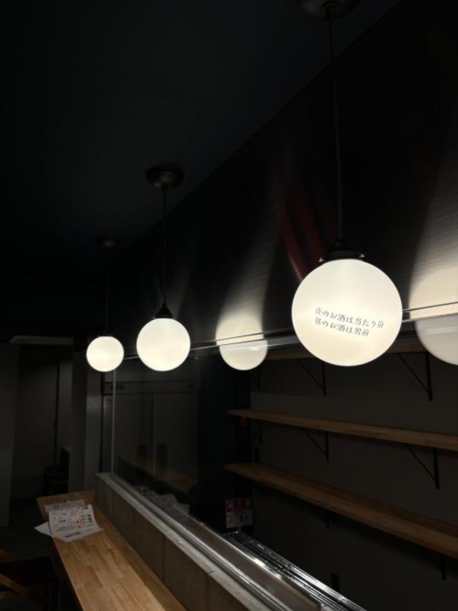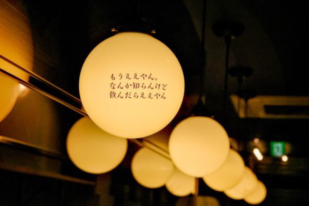 カウンター席の頭上にお洒落なライトが並び、どれも一つひとつ異なる言葉が書かれているので、飲みながら&読みながら楽しめます。