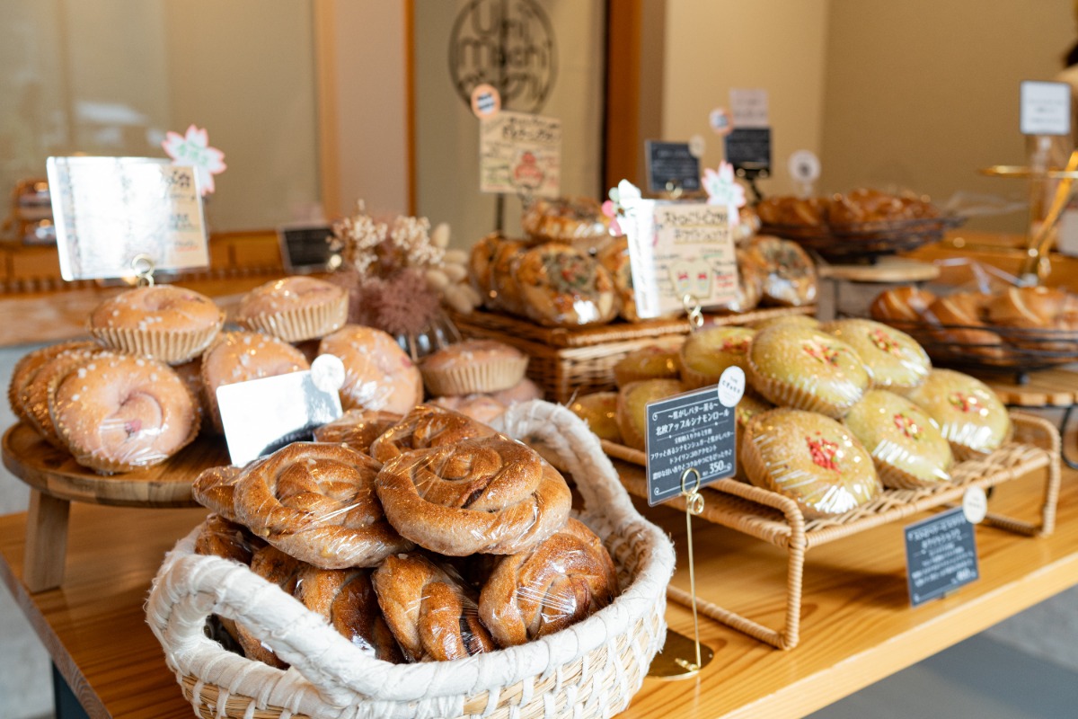 店内には、むぎゅモチ・ふわモチ・ダッチベーグル・プレッツェルの4タイプに分かれた、国産小麦と天然酵母にこだわった約20種類のベーグルがずらりと並びます。
