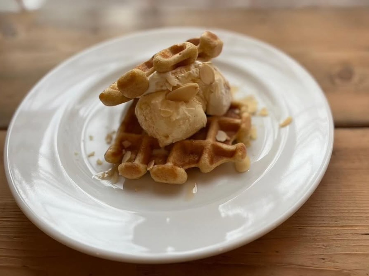 夜の営業では、パンケーキの提供はなくなりますが、代わりに夜限定のオリジナルの焼きたてワッフルが楽しめます。全粒粉入りのサックリとした食感が特徴です。お酒と一緒に楽しむ、ちょっと違った魅力のワッフルをぜひ!