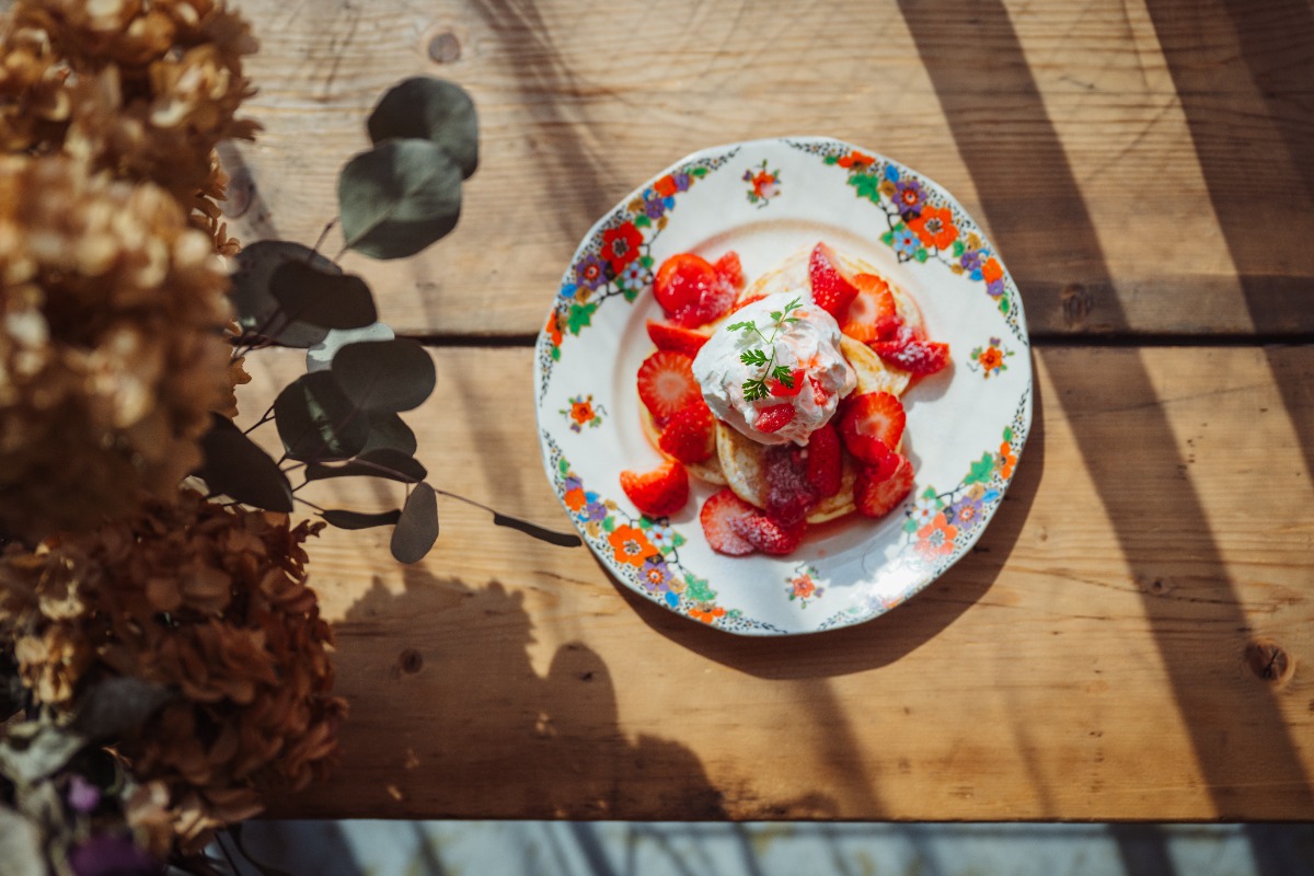 今の時期おすすめは期間限定の「シンプルいちごのパンケーキ」。ふんわりモチモチ食感のパンケーキ3枚とアイスクリーム、生クリーム、鬼北町にある「あかまつ農園」のイチゴをたっぷりと使用しています。徳島県の「アアルトコーヒー」のコーヒーと一緒に大人の贅沢なカフェタイムを楽しんでくださいね。