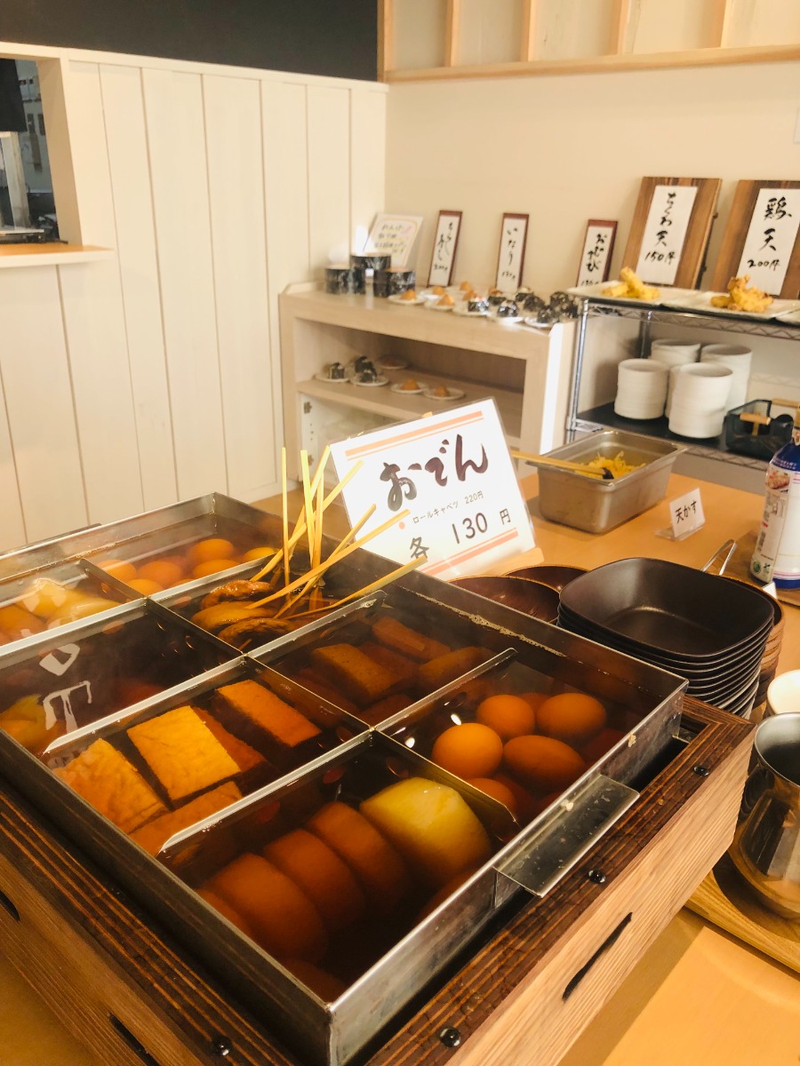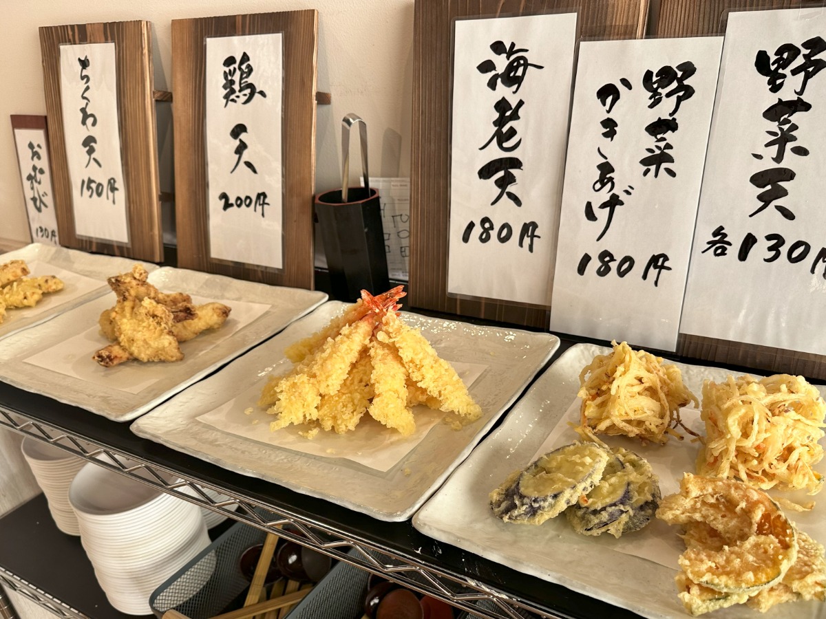 エビ天、とり天、野菜のかき揚げなど、常時5種類の天ぷらが並ぶ人気コーナー。極力揚げたてで提供されるので、サクッとした食感が格別です。風呂上がりに天ぷらと冷たいビールを楽しむ人も多く、ゆったりした時間が過ごせます。おかずとしても、ちょい飲みのお供にもぴったりです。