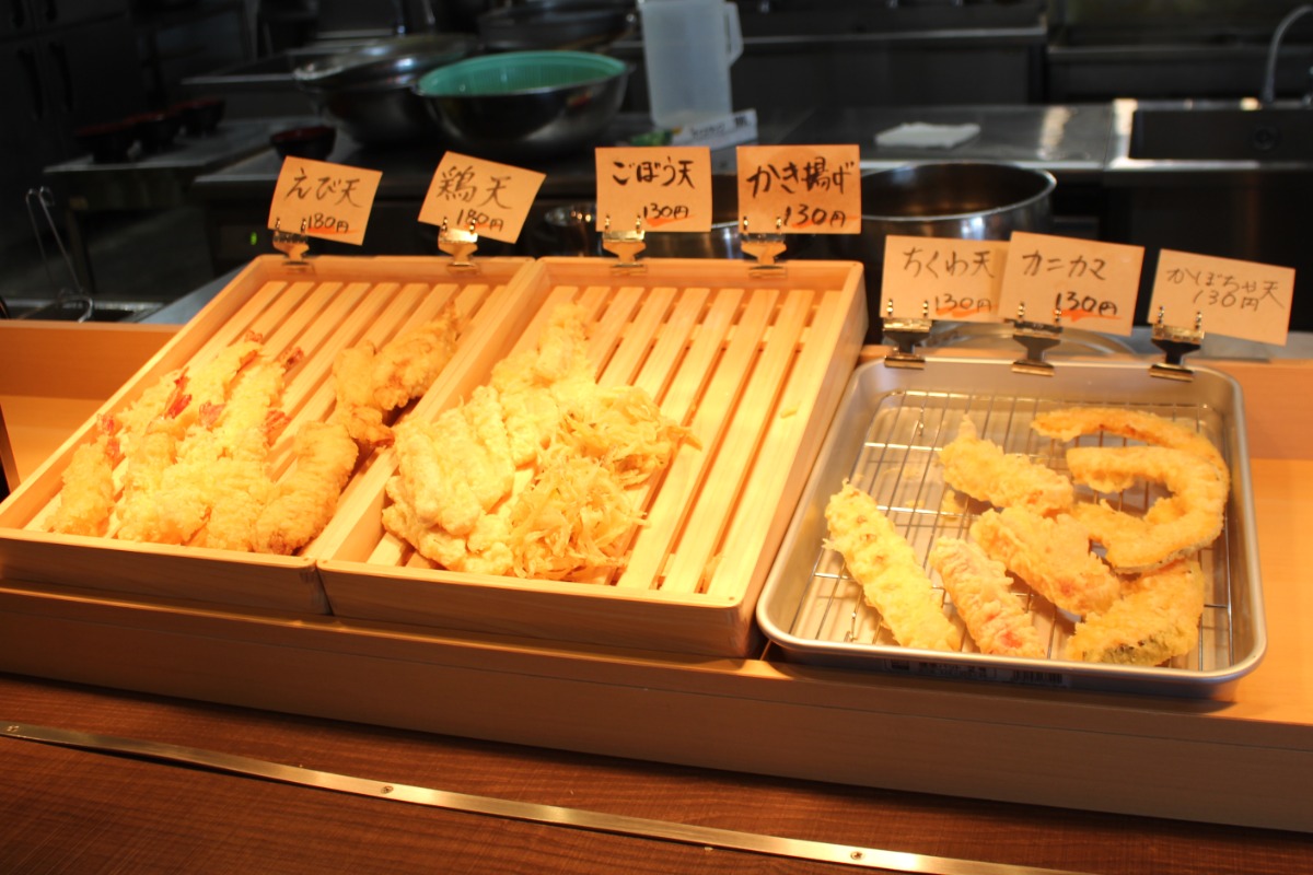 カラッと揚がった天ぷらは、えび天や鶏天、れんこん、かぼちゃなど、季節の食材を含め常時10種類以上がラインナップされています。