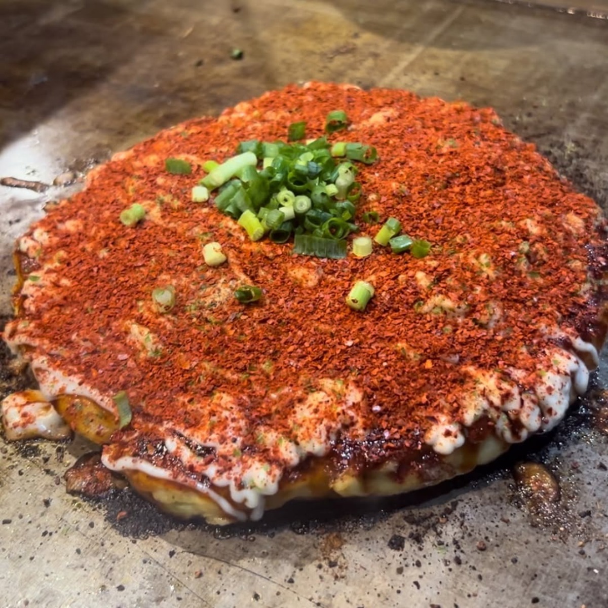 辛いもの好きにぜひ挑戦していただきたいのが、特製スパイシーなお好み焼き。ピリッと辛いソースがふわふわ生地にしっかり絡み、あとを引くおいしさです。