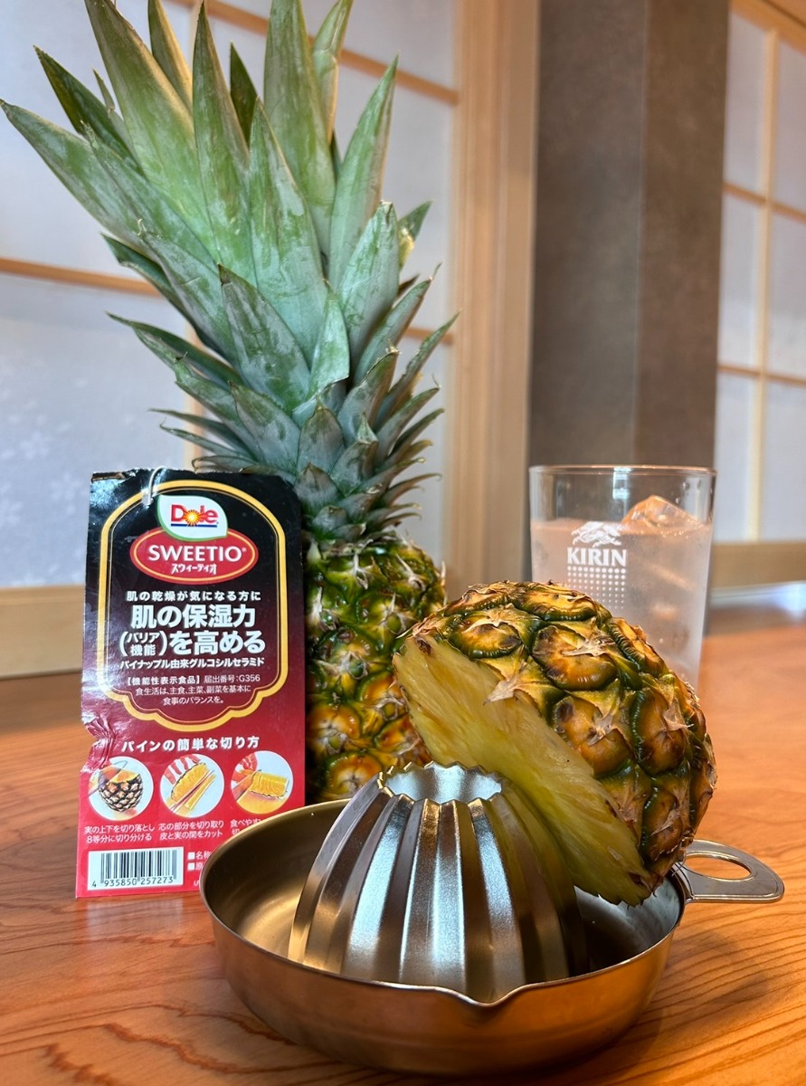 パイナップルを半分にカットし、自分の手で果汁を絞って作るユニークな一杯です。