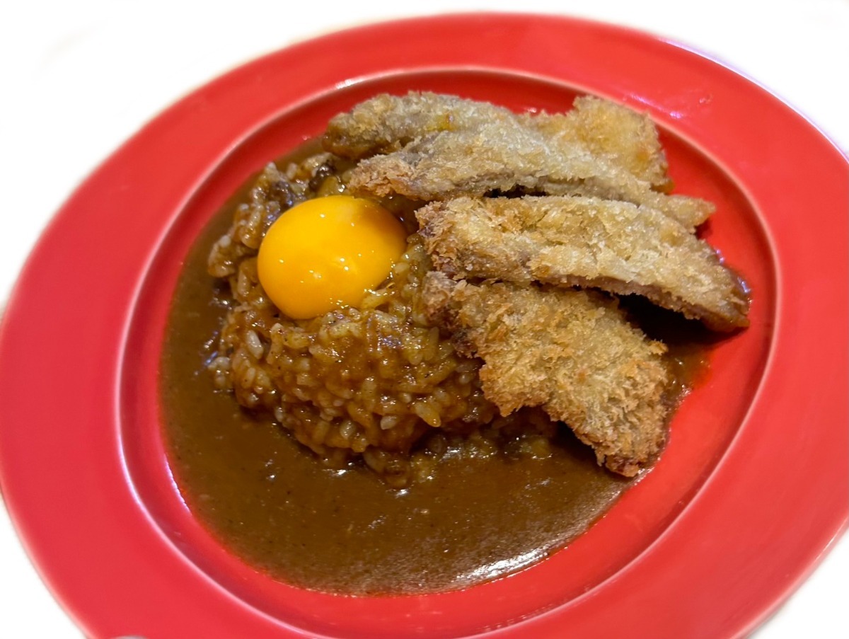 看板メニュー「カミカツのせ黒毛和牛カレー卵黄入り辛口」は、ピリッとスパイスが効いたルーが特徴。