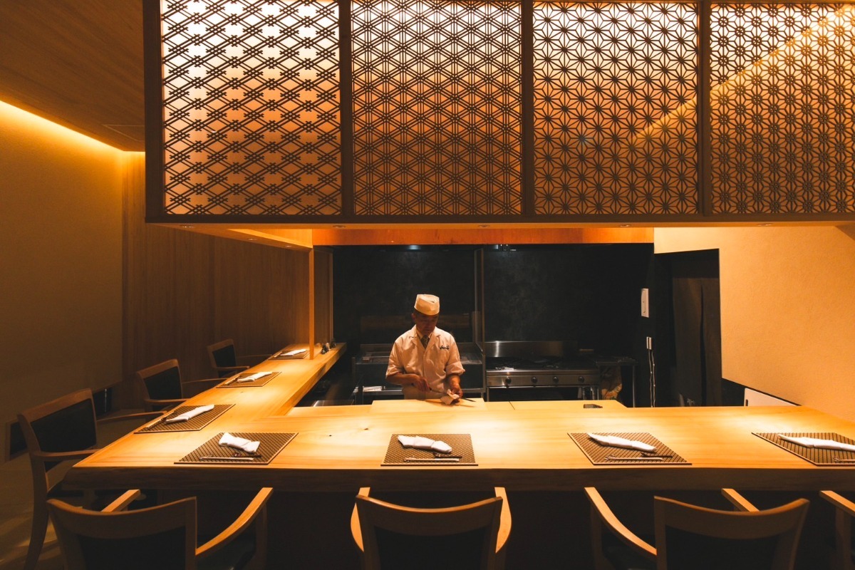 畳敷きのカウンター席には繊細な組子細工が施されていて、日本人が大切にしてきた願いや想いを表し、店内に特別な温かみをもたらしています。