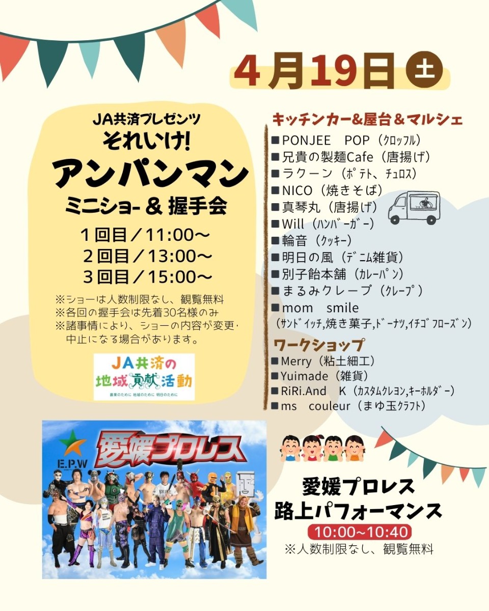 リニューアルを記念して、4月19日(土)には、愛媛の伝統芸能「臥龍太鼓」によるテープカットや、アンパンマンのミニショー・握手会、愛媛プロレスによる路上パフォーマンスなど、様々な催しが盛りだくさん!キッチンカーやマルシェもあるので三世代で楽しめます。
