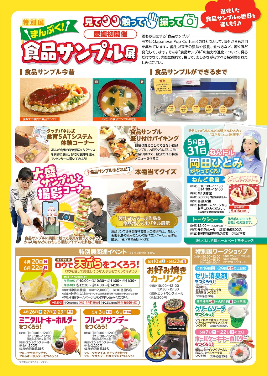 ロウで天ぷらのサンプルを作る体験会(要事前申込)や、Eテレで「おねんどお姉さんひとみ」「コネル」として出演中の岡田ひとみさんによるねんど教室とトークショー(要事前申込)、自分だけのミニタルトやサンデーをつくる体験、お好み焼きのストーンをすべらせる「お好み焼きカーリング」などを開催予定♪