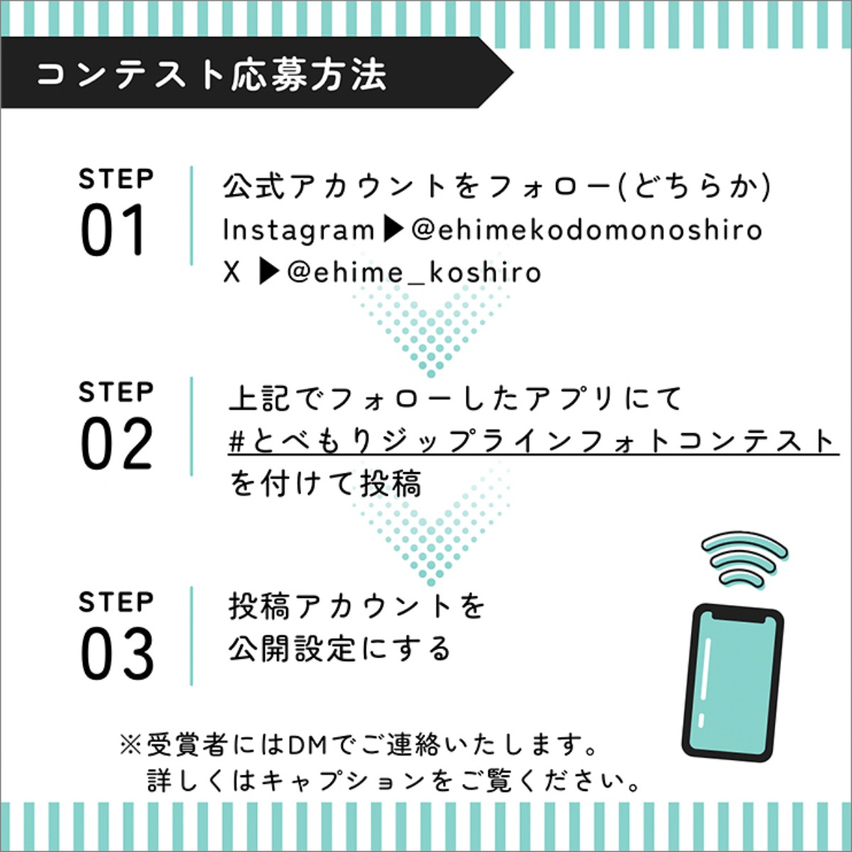 応募方法はこどもの城公式instagramとX(旧Twitter)をフォローの上、「#とべもりジップラインフォトコンテスト」をつけて写真を投稿するだけ!