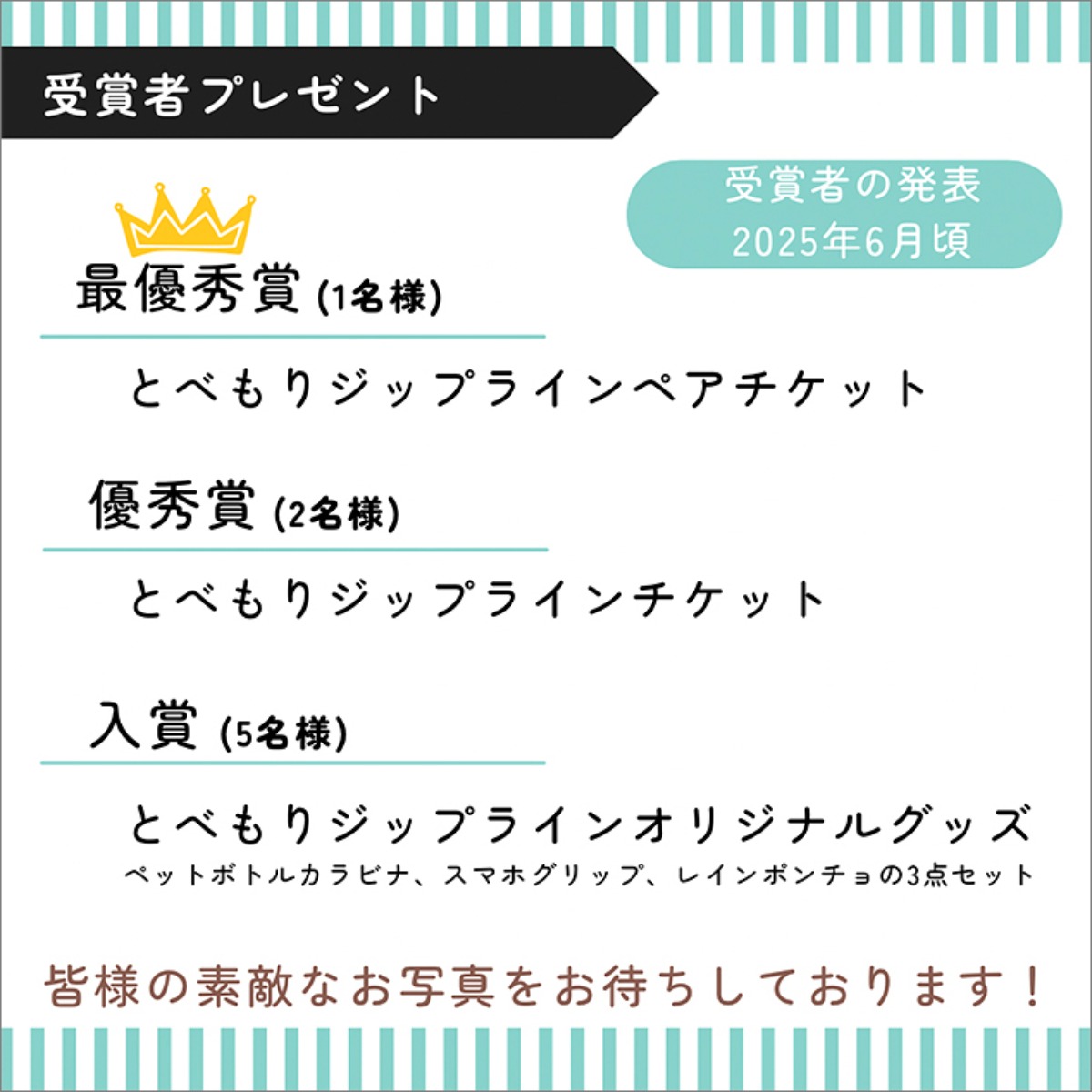最優秀賞(1名様)はとべもりジップラインペアチケットが、優秀賞(2名様)はとべもりジップラインチケットが、入賞(5名様)はとべもりジップラインオリジナルグッズがもらえるので、お見逃しなく!