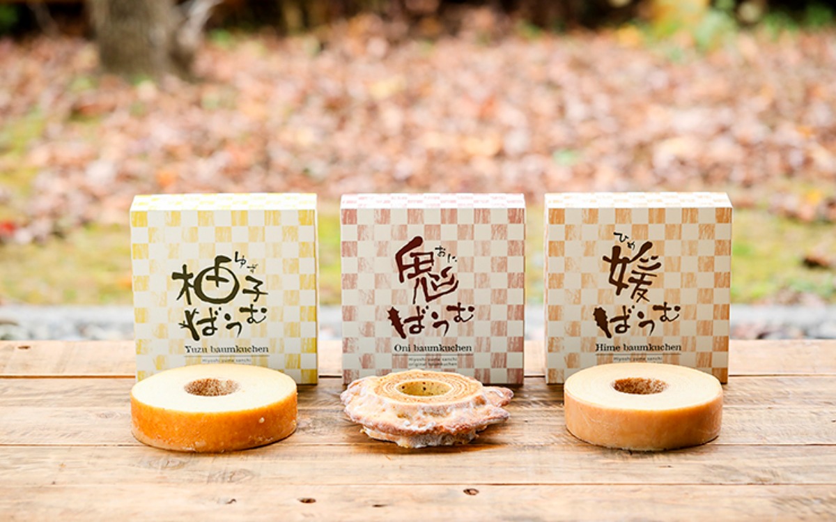 バームクーヘンは、ハードタイプの「鬼ばうむ」と、ソフトタイプの「媛ばうむ」、鬼北町特産のゆずを使用した「柚子ばうむ」の3種類。