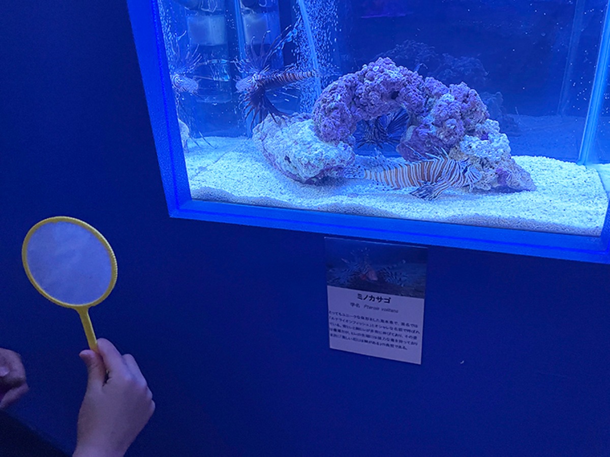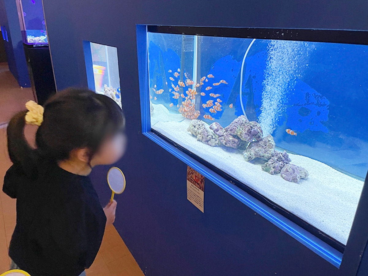 水槽は子どもの目線に合わせて設置されていて、小さな子でもじっくり観察できるのが嬉しいポイント。