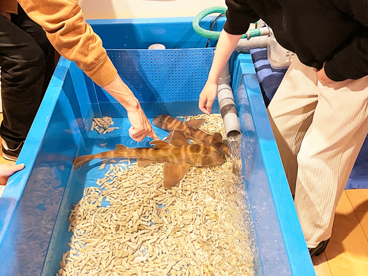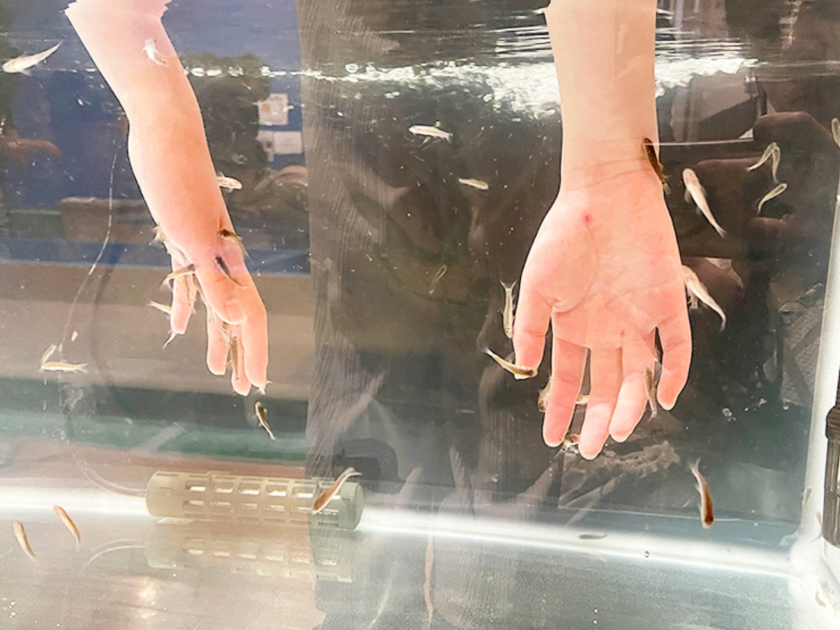 「遊べる水族館」というコンセプトの通り、ヒトデやサメに直接触れられるタッチプールや、手を水に入れて魚がつついてくれるフィッシュセラピーも無料で体験できます。