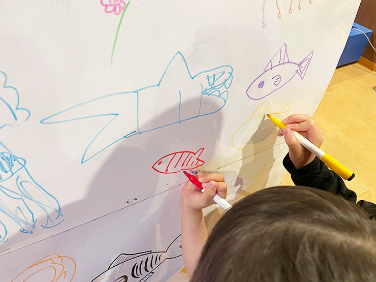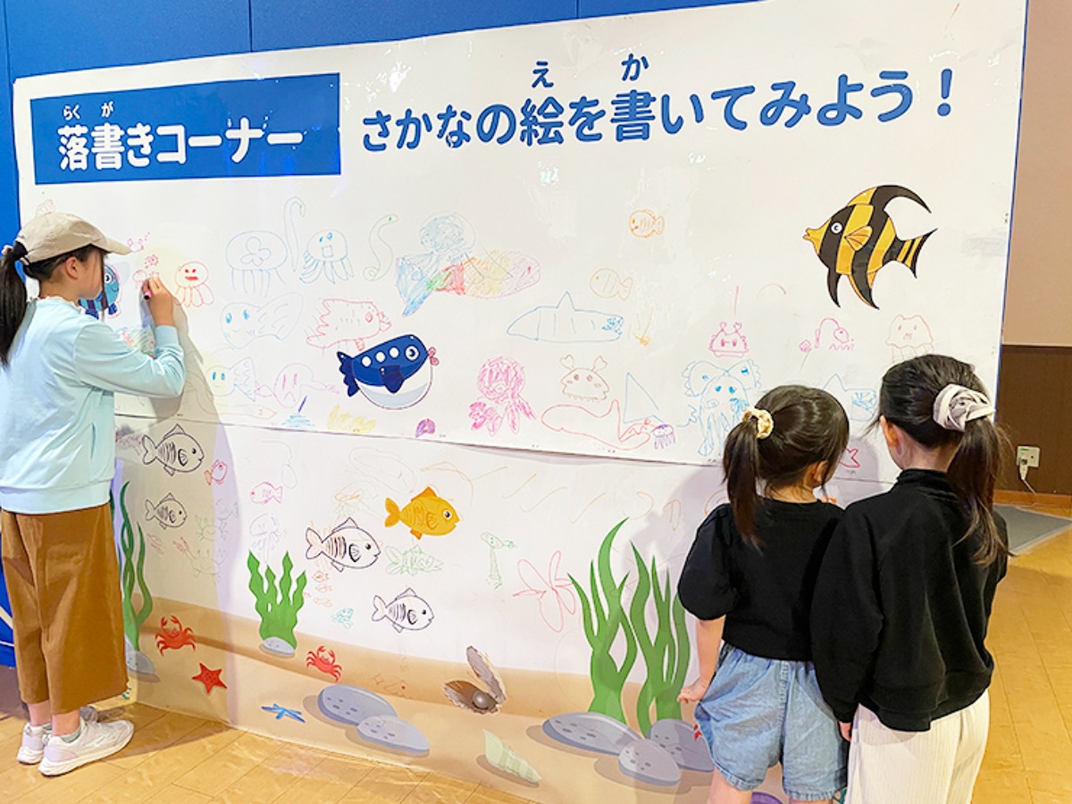 「これ上手!」「うちも描いてみたい!」と親子で盛り上がれるスポットで、まさに“遊べる水族館”の名の通り。