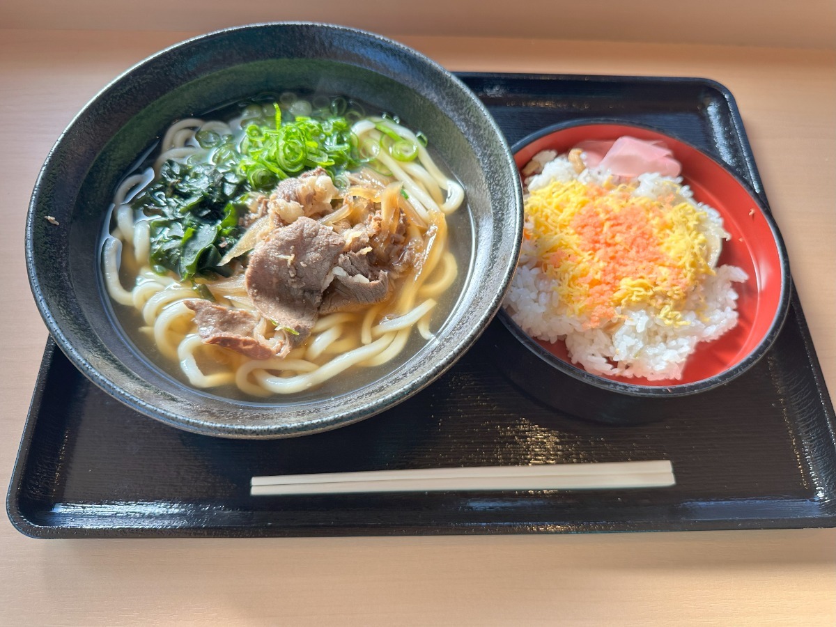 うどんの右側にある、見た目が華やかな「ちらし寿司」は、彩り豊かな具材が乗ったあっさり味で子どもにも人気。親子でシェアしやすい一品です。