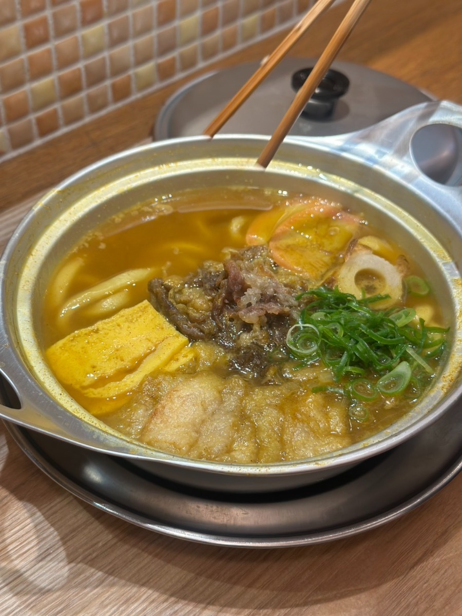 写真の「鍋焼カレーうどん」は結庵オリジナルの一品で、スパイスをたっぷり使用しているのが特徴です。