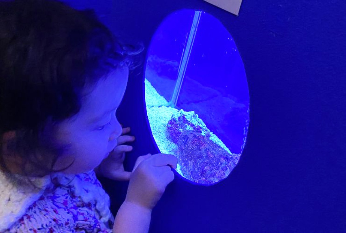 低い位置に展示されていたのはちょっと変わったカニや大きなエビだったので、娘ちゃんをもっと可愛い生き物のところに連れて行こうとしたのですが、自分で見れることの嬉しさが勝ったようで、水槽から全然離れようとせず。