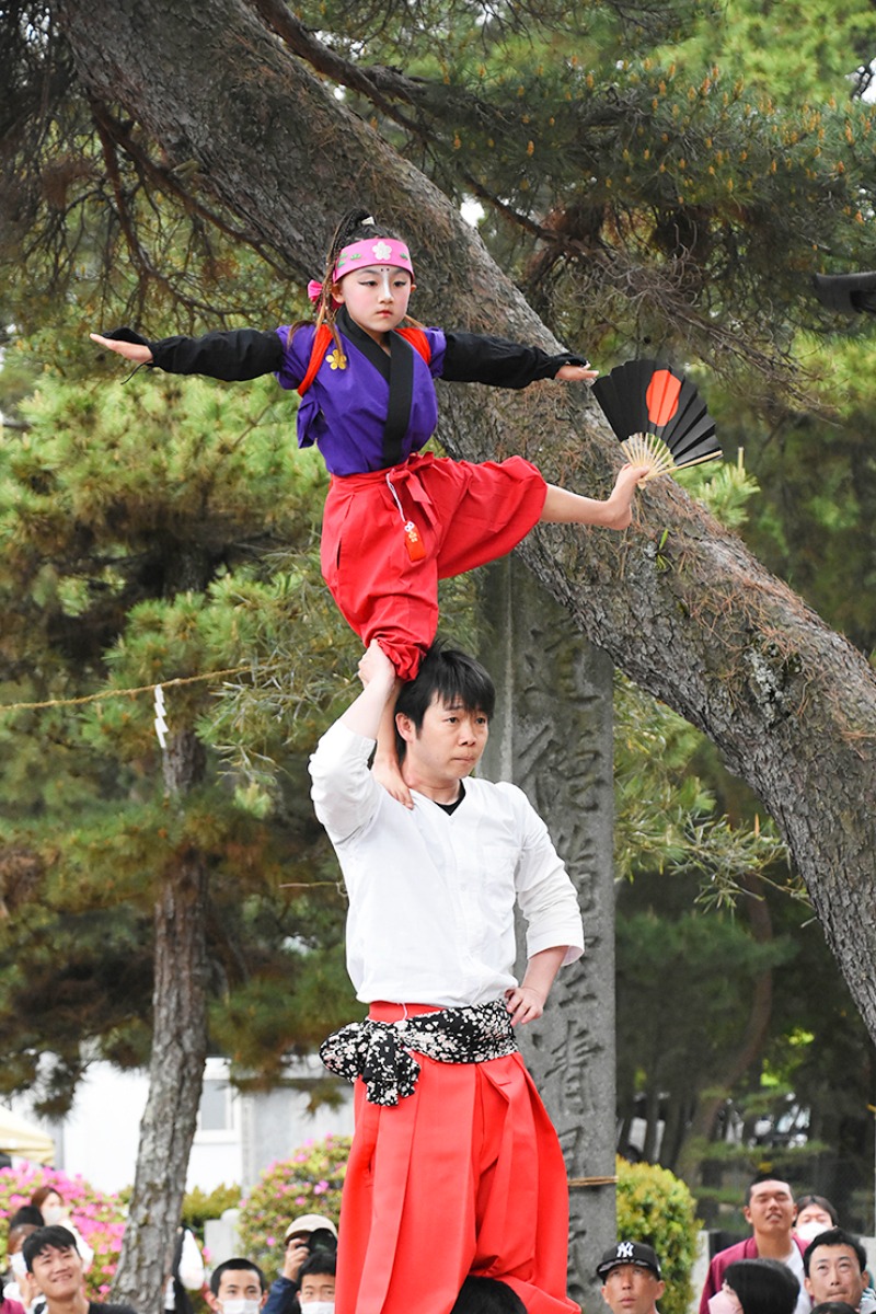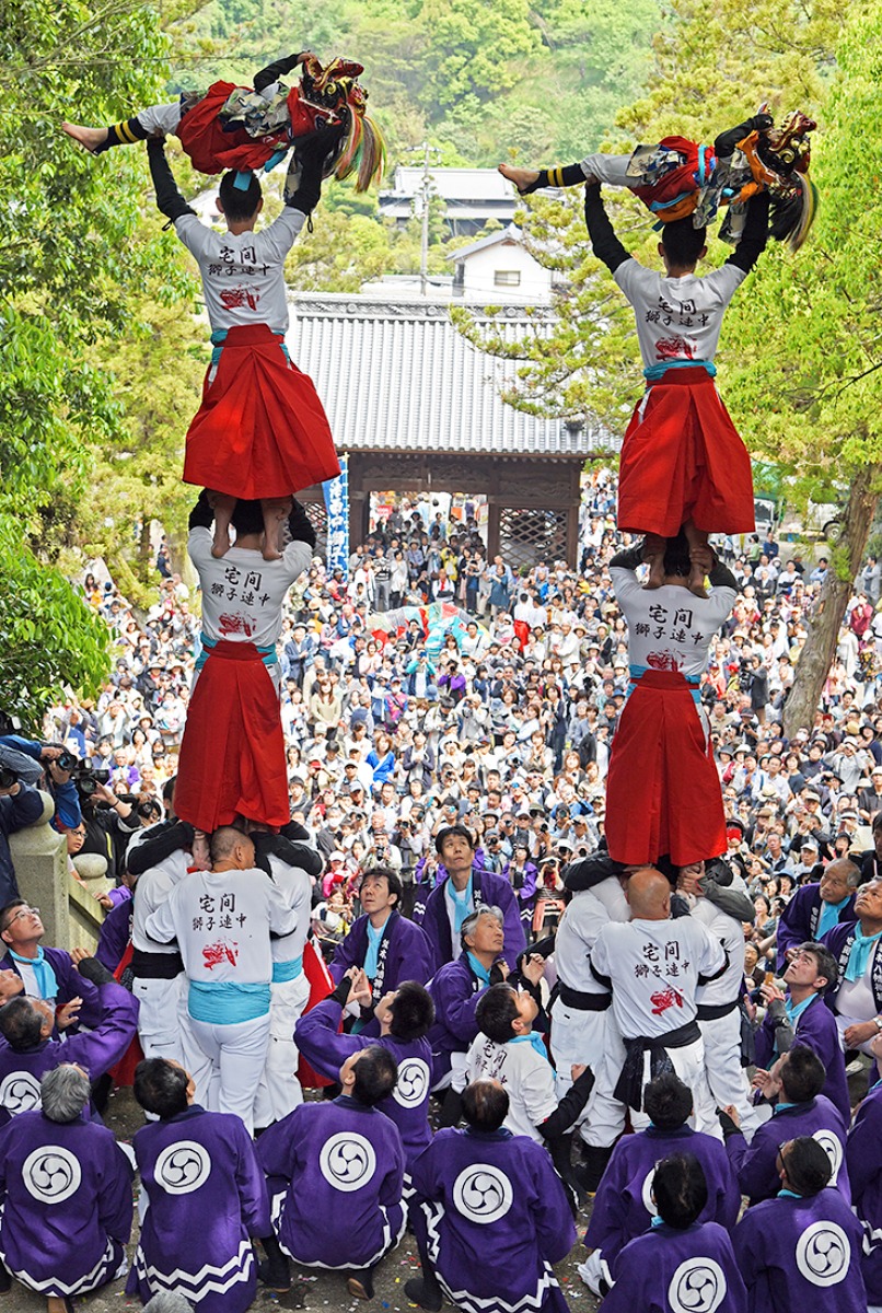 祭りの期間中、今治市内の神社では、日替わりで異なる継ぎ獅子の演技を観ることができます。