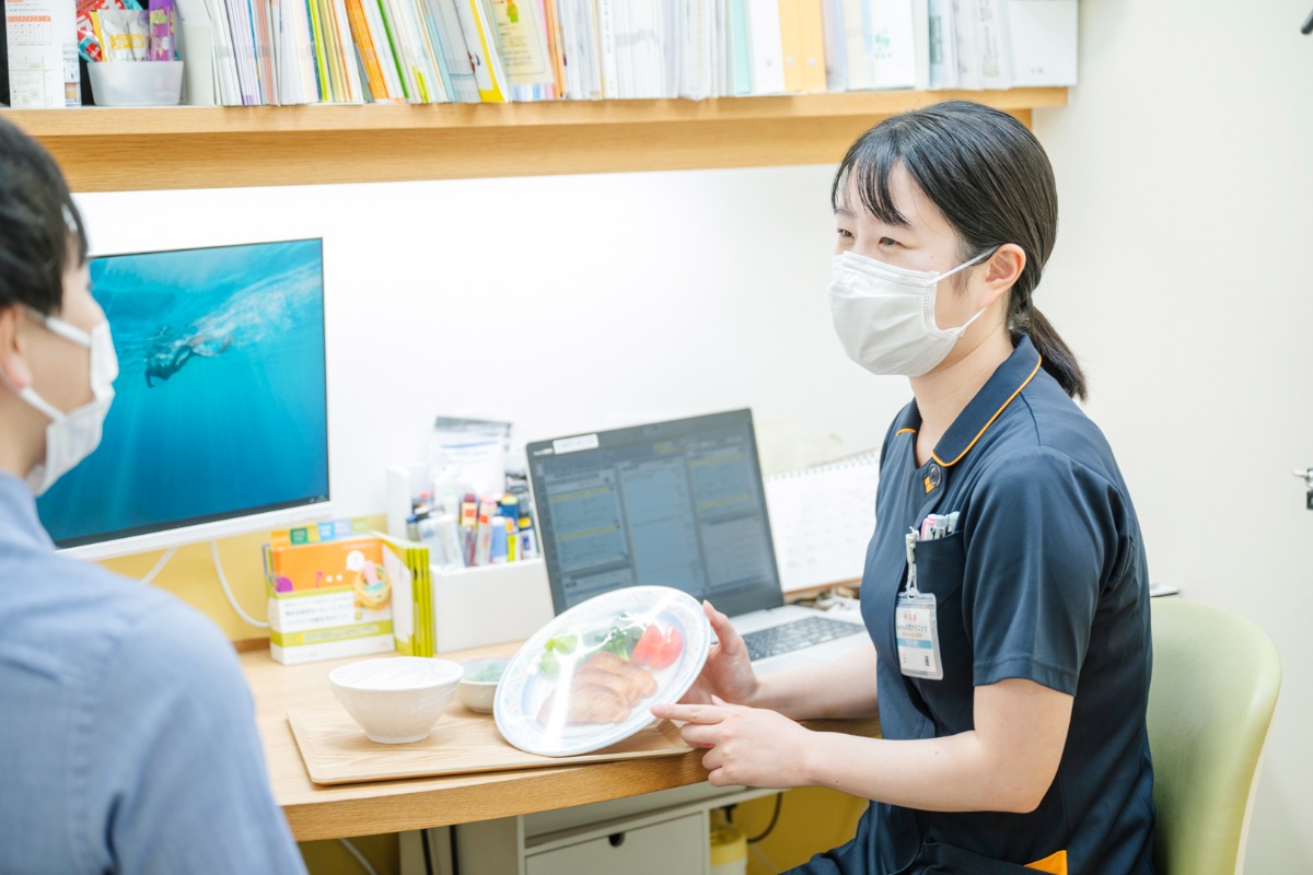 同院では、看護師・管理栄養士・臨床検査技師・事務員がそれぞれの専門性を活かし、患者一人ひとりに適したサポートを提供。診察前の問診ブースでは、看護師が患者の声を丁寧に聞き取り、栄養士による食事指導も実施。