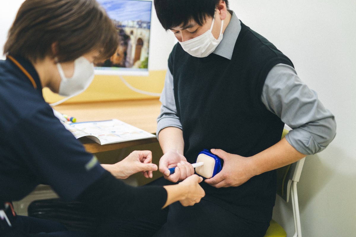 ▲インスリン注射部位の確認を行い、適切な注射ができているかをチェック