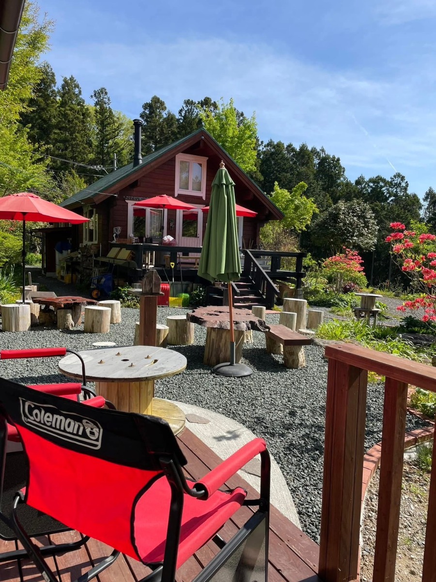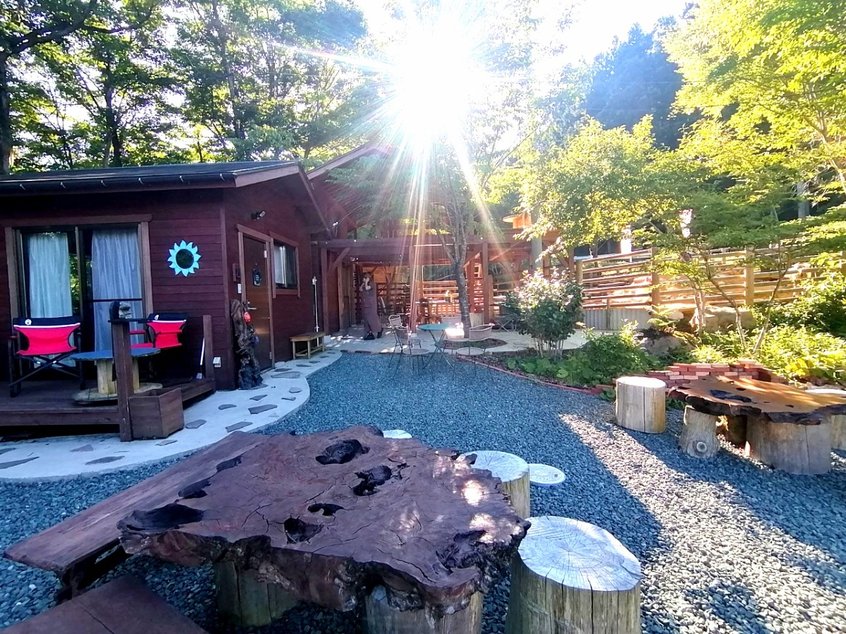 敷地内の庭は、木のテーブルや丸太の椅子が並べられており、バーベキューでお腹を満たし動物たちとふれあった後、ゆったりと過ごすのに最適な空間です。