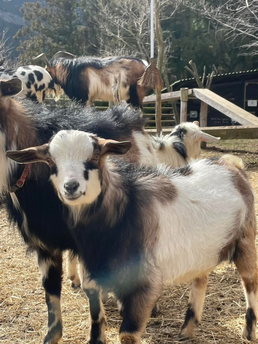 ここへのアクセスは、高知県へと繋がる国道33号線沿いの面河川と久万川の合流点にある名勝「御三戸嶽」を左に見ながら県道328号線を上って行き、分かれ道に来たら旧美川スキー場方面へとさらに山道を進んでいきます。すると、突如現れるお洒落なログハウス。敷地内には可愛いヤギさんたちの姿も!! 想像以上に素敵な空間に思わず大興奮してしまいました!
