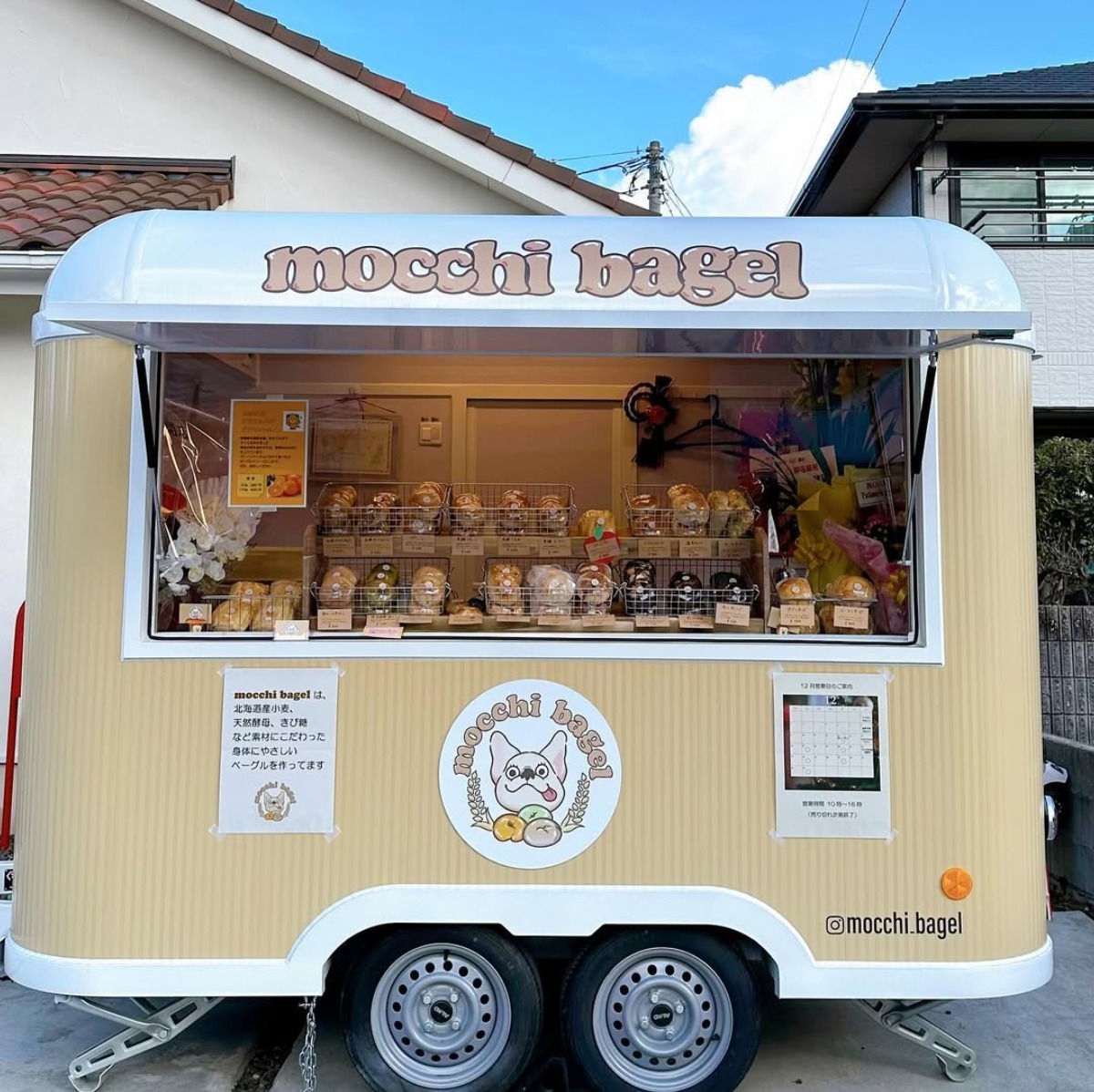 松山市の三津浜地区・祓川公園近くに2024年12月オープンしたキッチントレーラーの店「mocchi bagel」(モッチベーグル)。