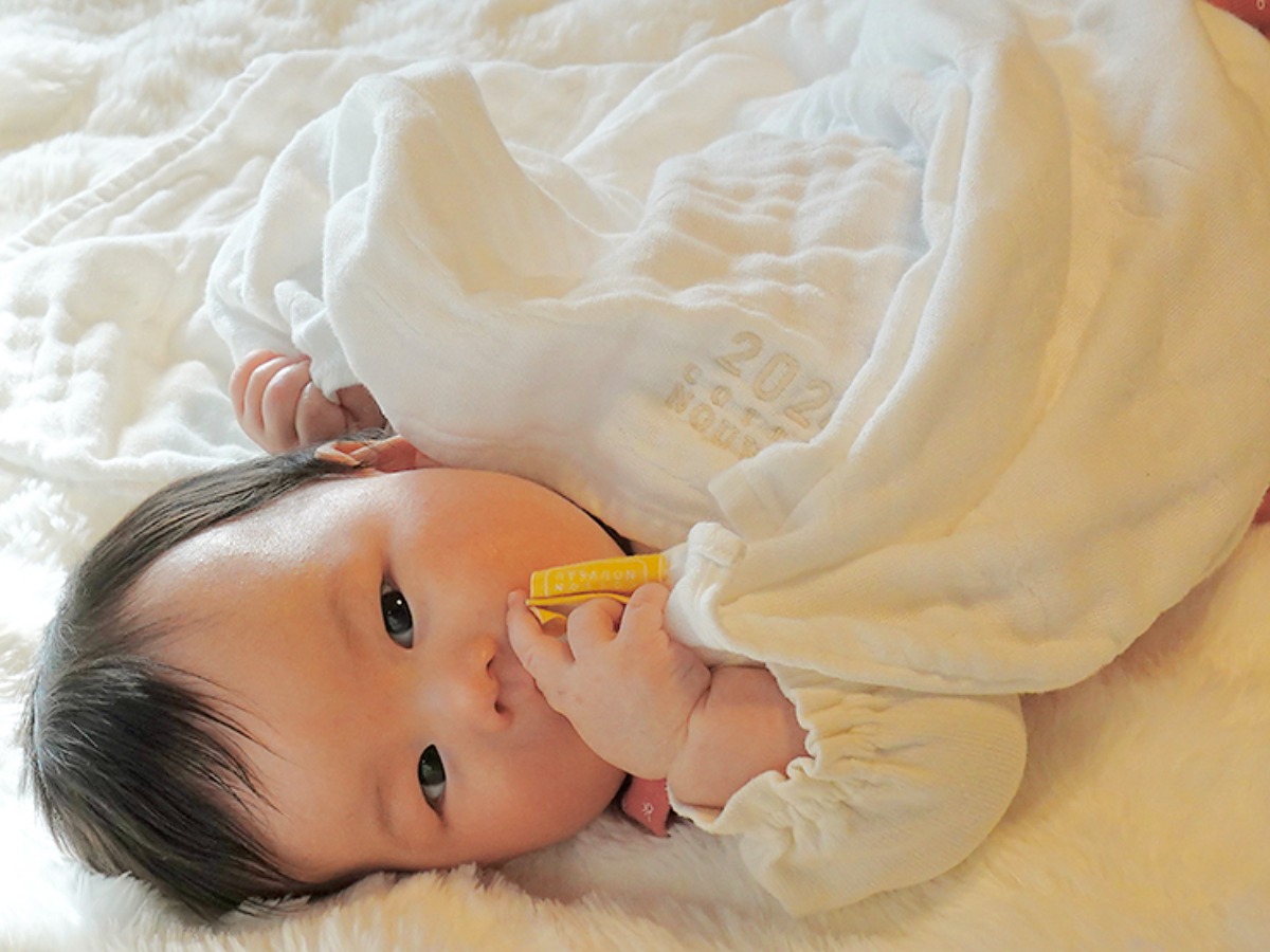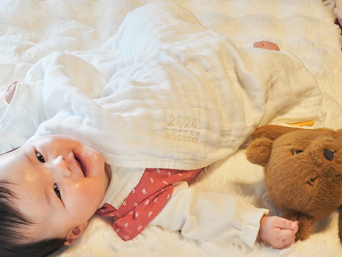生後4ヶ月のベビーとコットンヌーボー2024ガーゼブランケット。