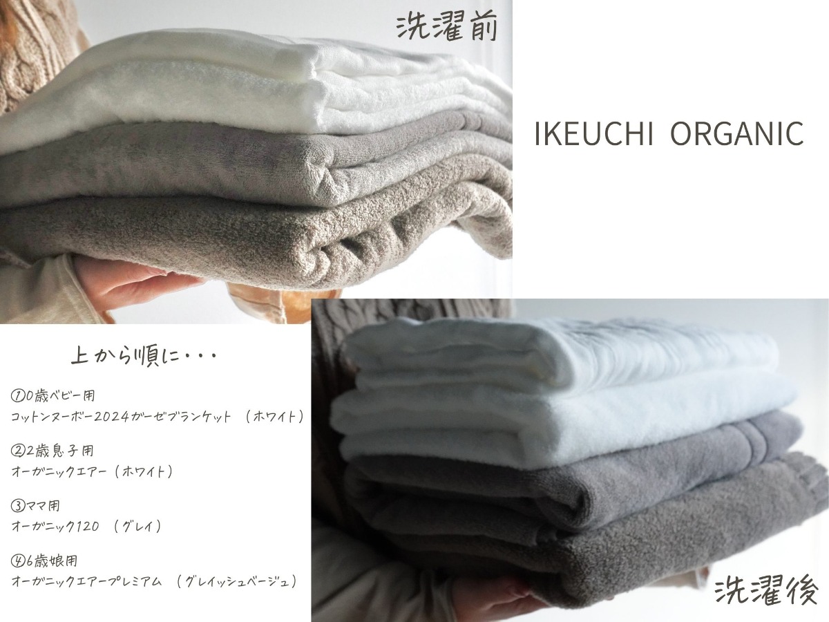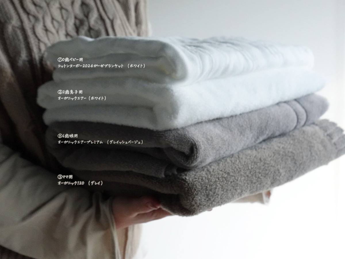 今回、3種類のイケウチオーガニックのバスタオルを家族みんなでしばらく使いまわしてみて、それぞれの使い心地を比較してみました!