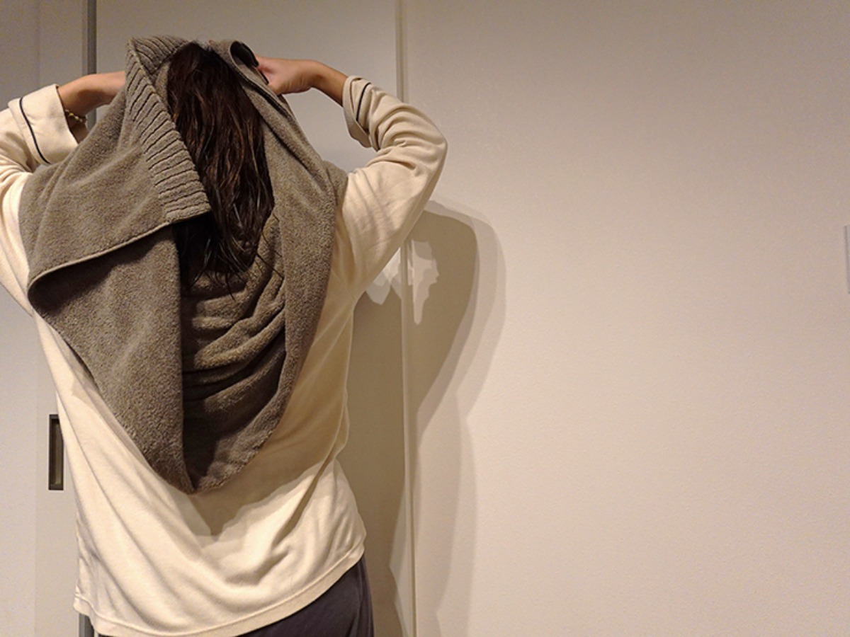髪が長いと、首にタオルをかけていても気が付くと背中が濡れちゃっている…ということがあるのですが、このタオルだとそれが全くないんです。