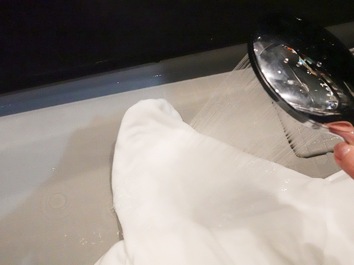 コットンヌーボーはベッドに敷いたり、おくるんだりと色々汚れることが多いのですが、なぜか擦り洗いをしなくてもシャワーをかけると汚れが落ちます。