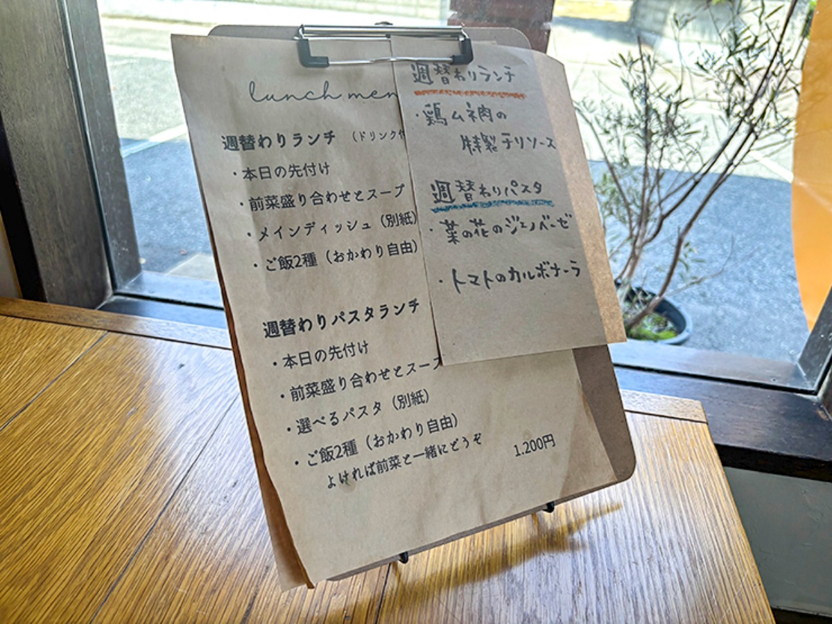 ランチタイムのメニューは、メイン料理が楽しめる「週替わりランチ」と、「週替わりパスタランチ」の2種類。