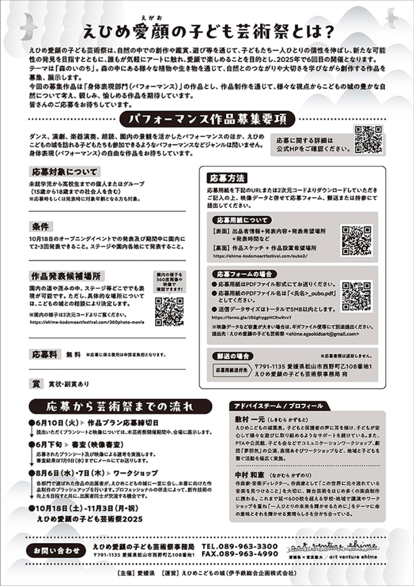 お問い合わせ/えひめこどもの城 えひめ愛顔の子ども芸術祭事務局 089-963-3300