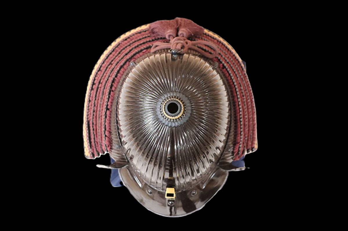 蝦胴鋼鉄黒塗具足 宇和島藩3代藩主伊達宗贇所用より六十二間筋兜(画像は頭頂部)