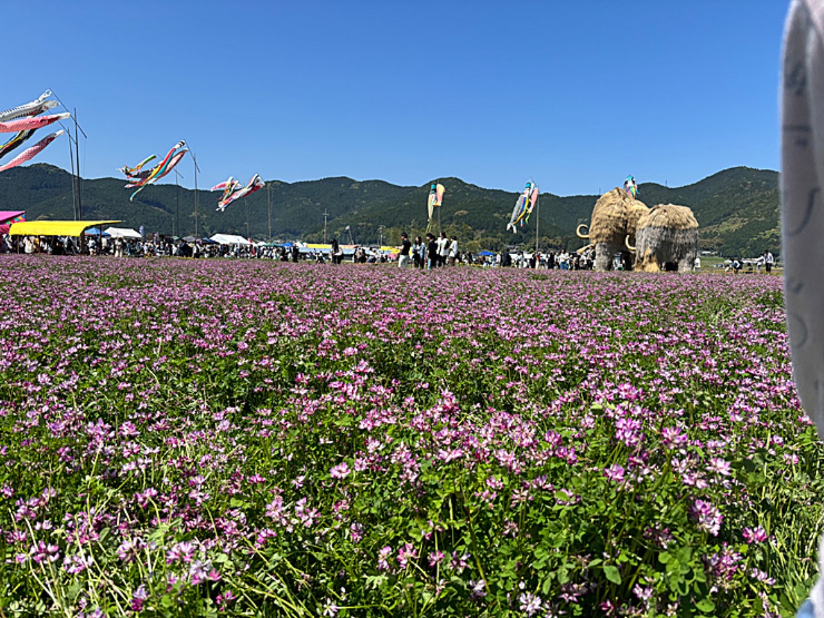 れんげ畑に映えるこいのぼりとわらマンモス。