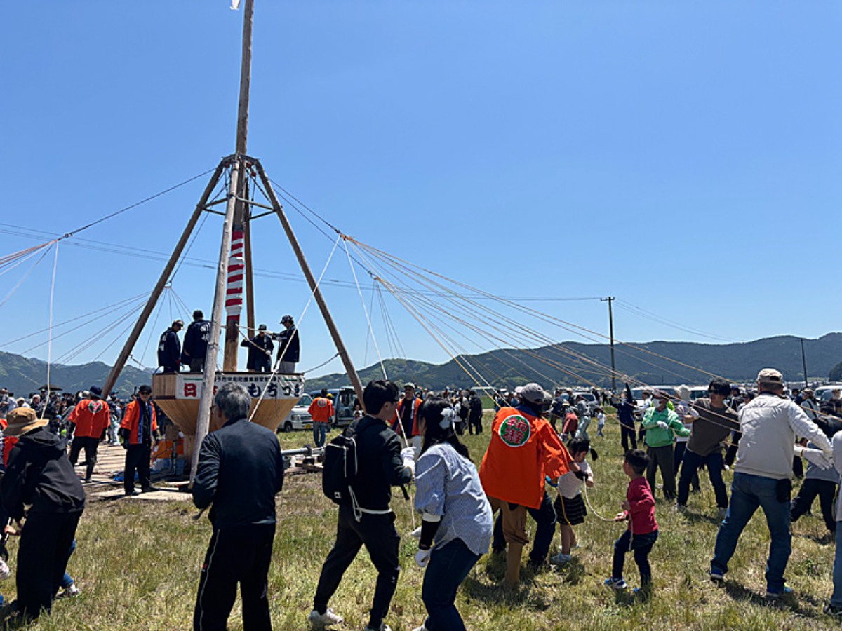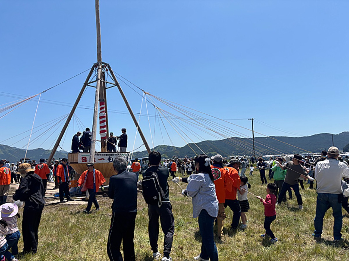 四方八方にのびている紐をもって、掛け声に合わせて引っ張ると中央の棒が持ち上がります。