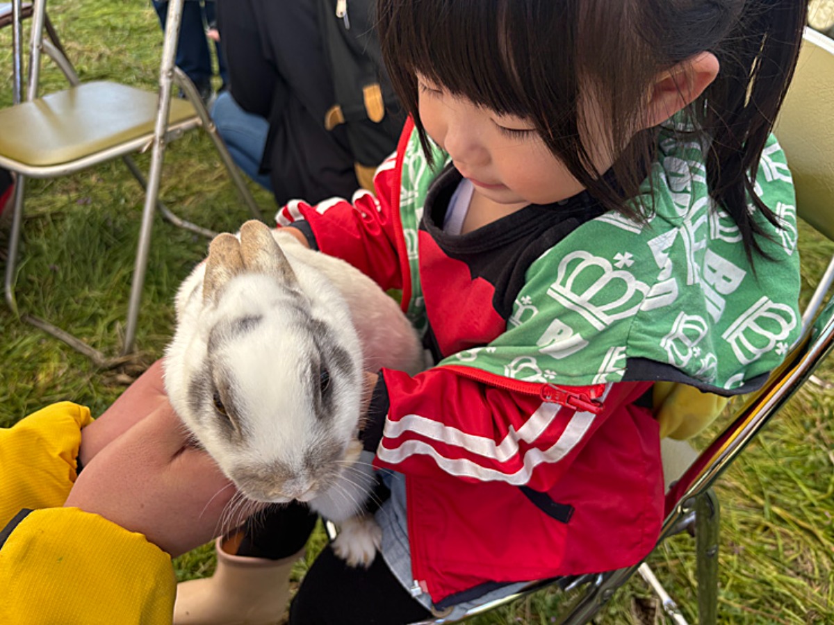 初めてうさぎを抱っこさせてもらって緊張ぎみの次女。